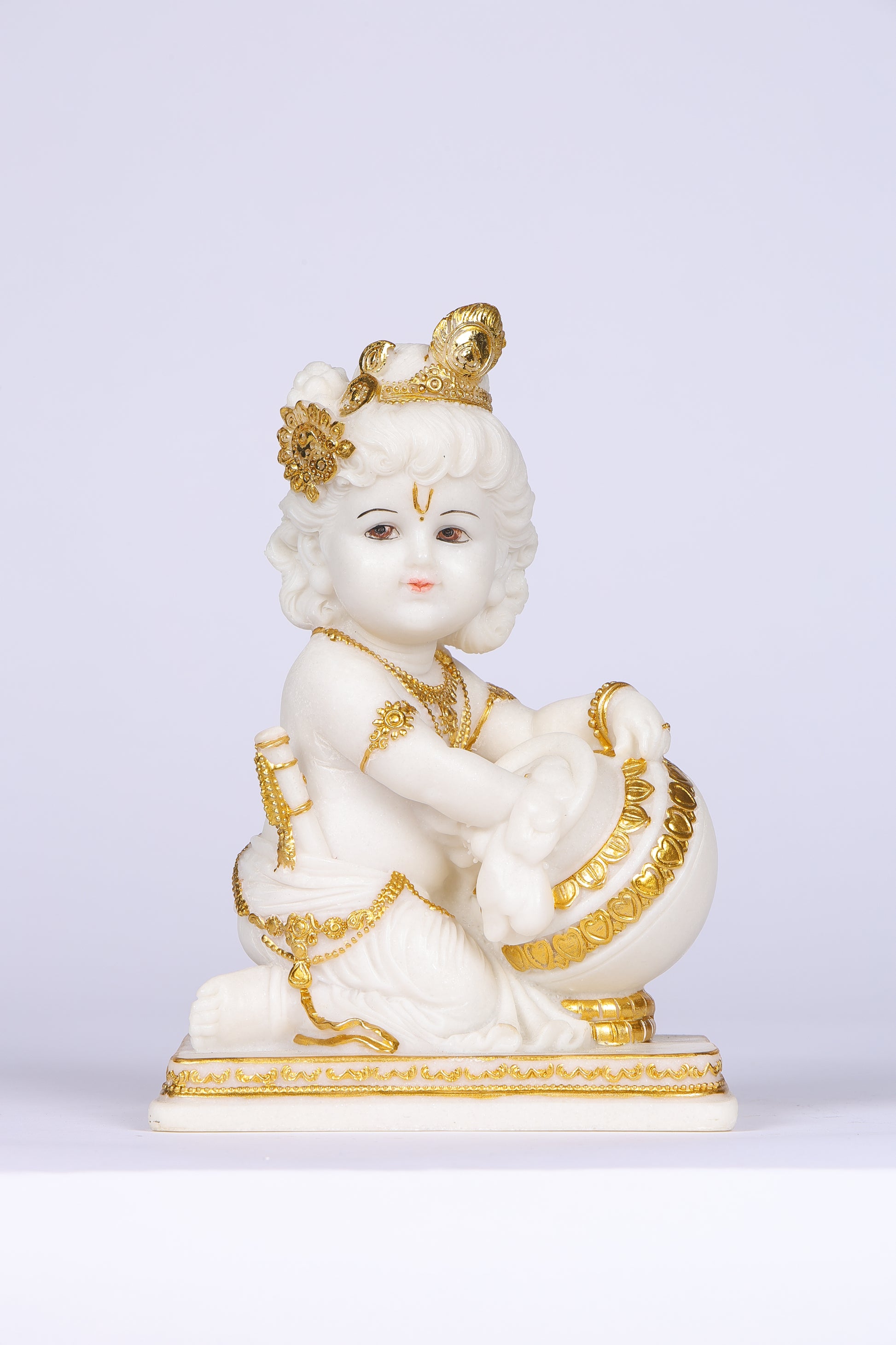 8" Baby Krishna - Cute Makhan chor Bal Gopal Marble statue with gold tone | Ideal for temple or showpiece