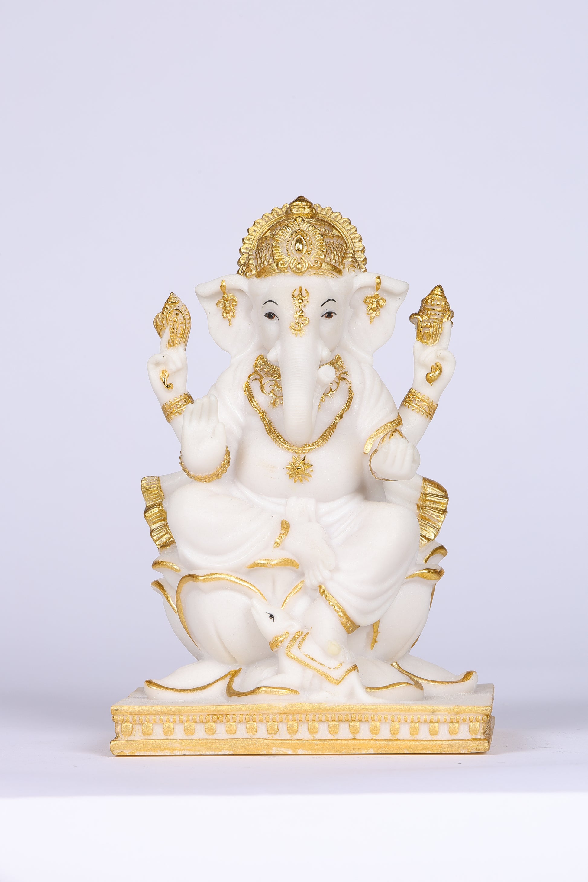 10" Ganesha sitting Marble statue on golden pedestal | Ideal for temple or showpiece