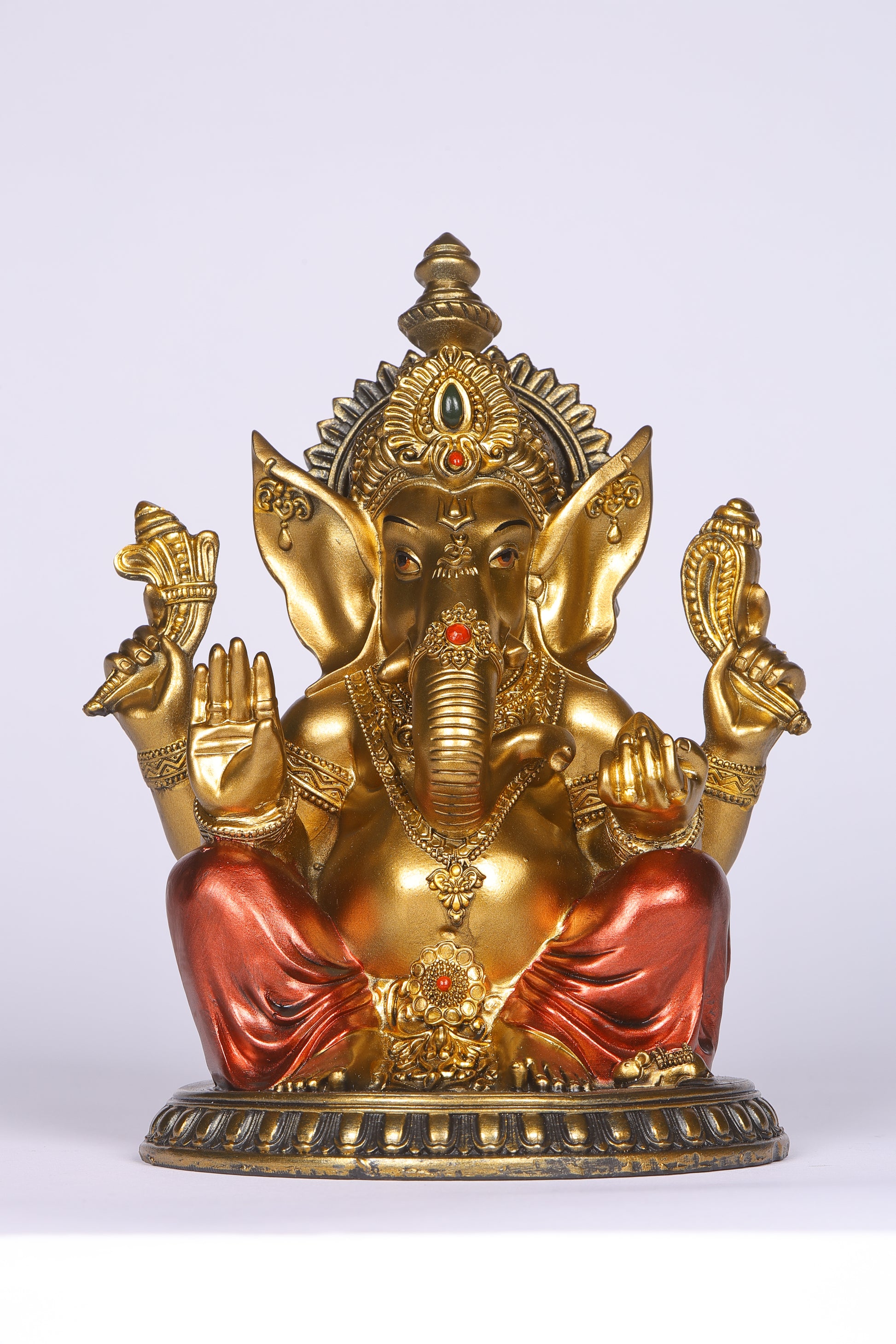 8" Ganesha sitting Antique Finish golden red statue on golden pdestal | Ideal for temple or showpiece