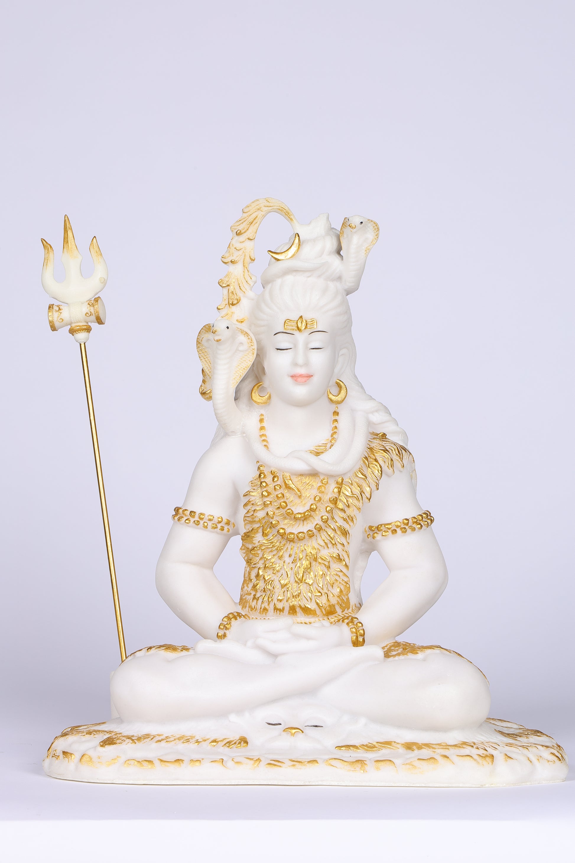 16" Shiva Samadhi Meditation statue with Trishul in White marble with gold tone | Ideal for temple or showpiece