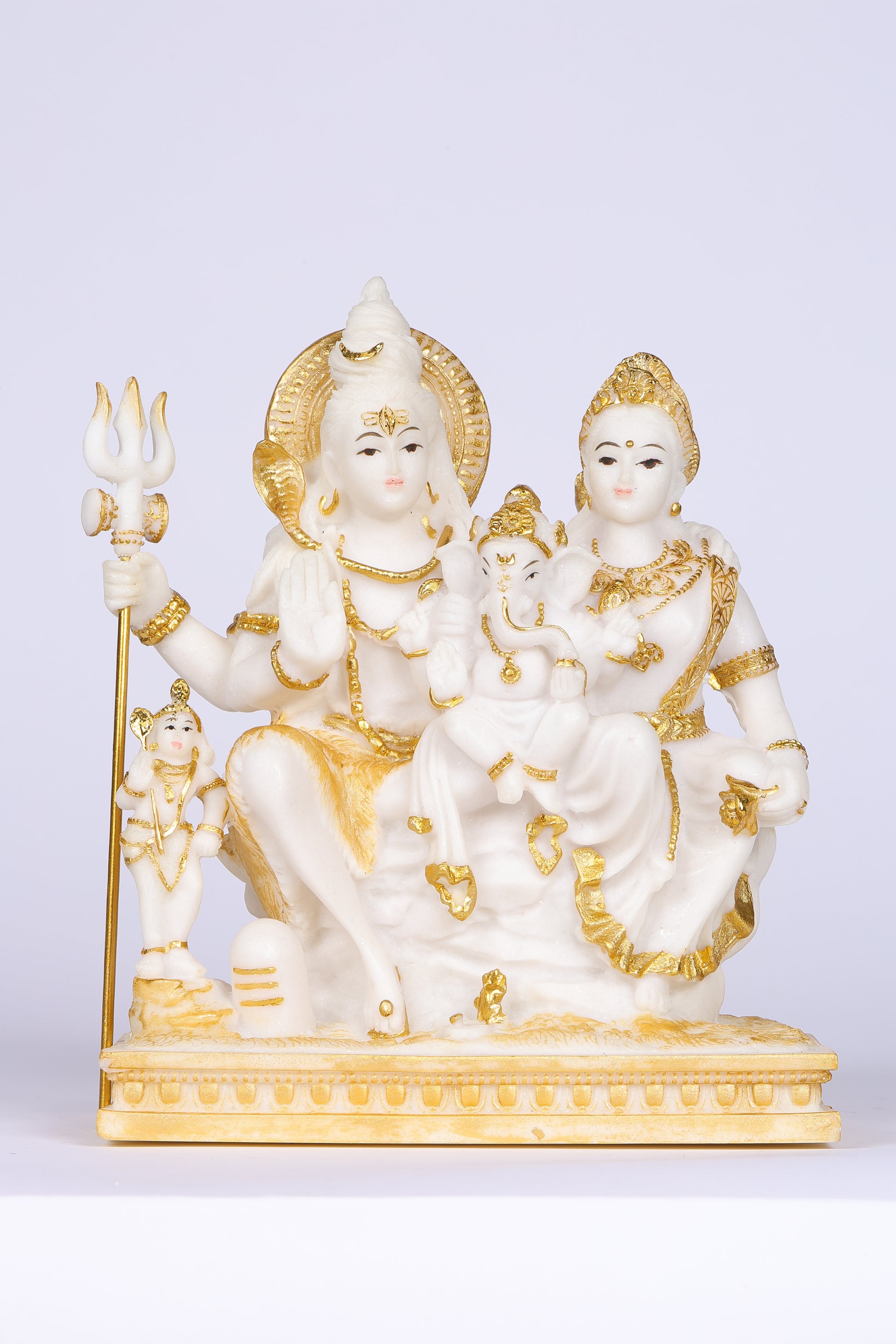 9" Shiva Parivaar sitting on Gold toned Marble statue - Shiva Prvati Gamesha and Kartikeya| Ideal for temple or showpiece