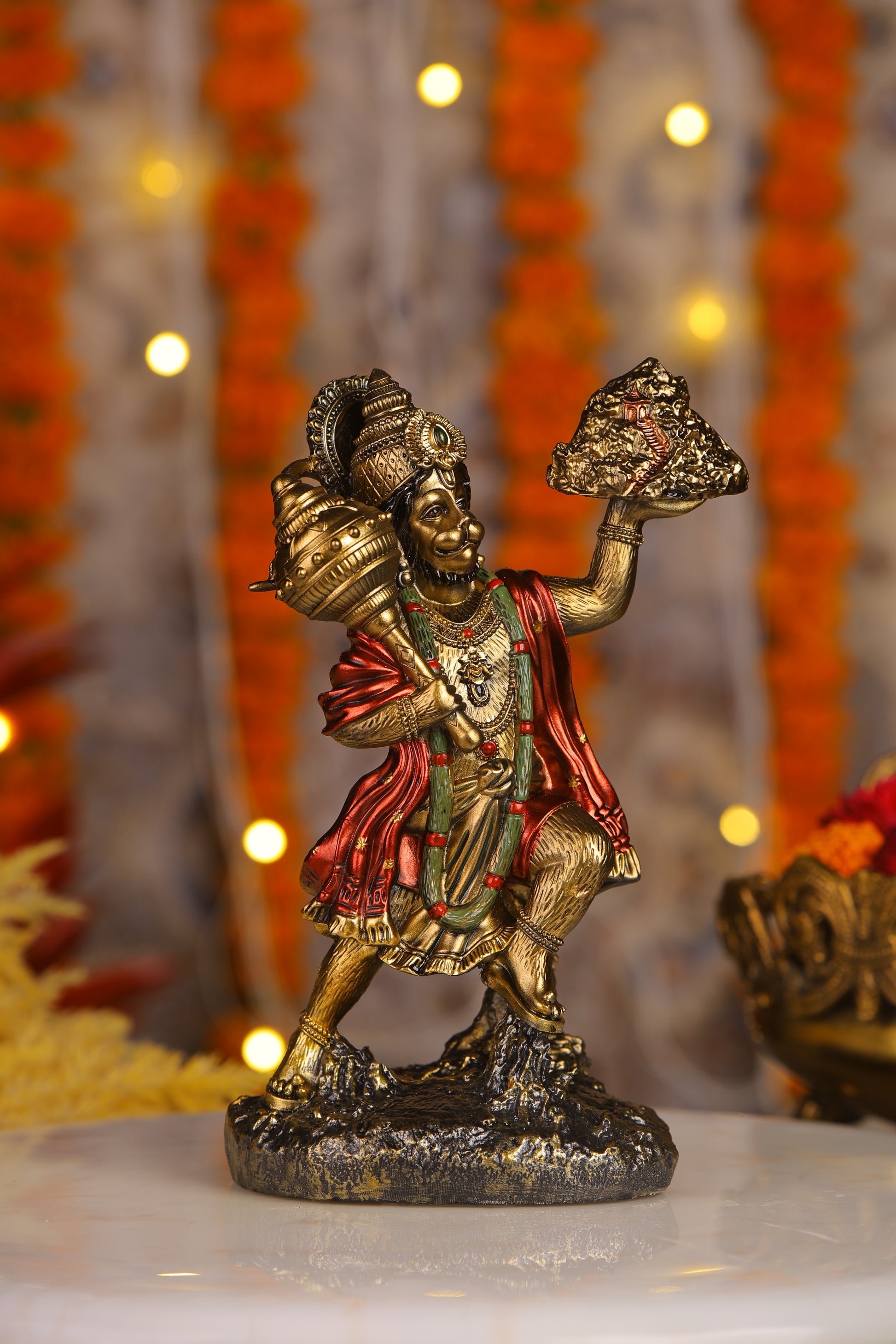 9" Hanuman Pawansut Mahabali standing Antique Finish golden red statue statue with Parvat | Ideal for temple or showpiece