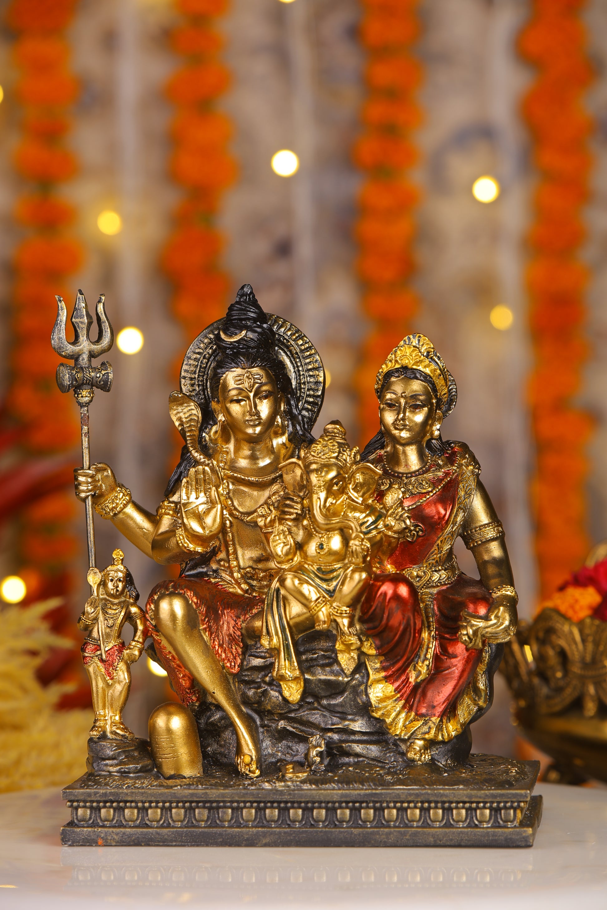 9" Shiva Parivaar sitting Antique Finish golden red statue - Shiva Prvati Gamesha and Kartikeya| Ideal for temple or showpiece